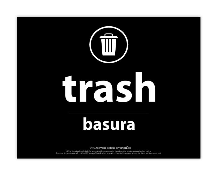 There is a standardized label created for nearly every sorting need and size for nearly every bin. If you need a standardized label to be modified to a special size or material or wish to add your logo, please contact us at info@recycleacrossamerica.org.